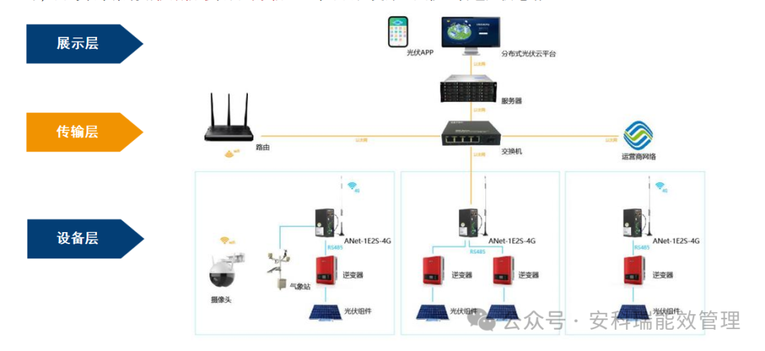 ANet-1E2S-4G网关采集逆变器交直流侧数据,通过有线或无线方式,上传至Acrel-1200光伏运维云平台。此外,还可以采集现场视频信号以及气象信息。帮助用户更好地监视、管理光伏电站。