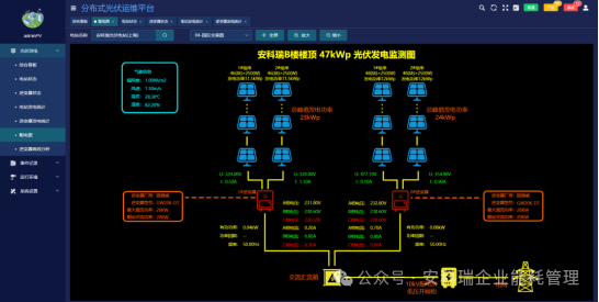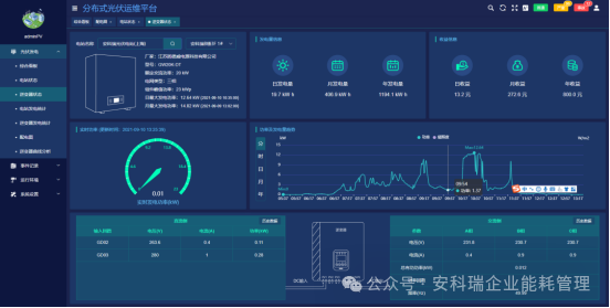 展示光伏电站名称、位置、逆变器数量等基本信息;统计当前光伏电站日、月、年发电量;按汇流数据分散分析每组光伏组件发电功率以及工作状态。
