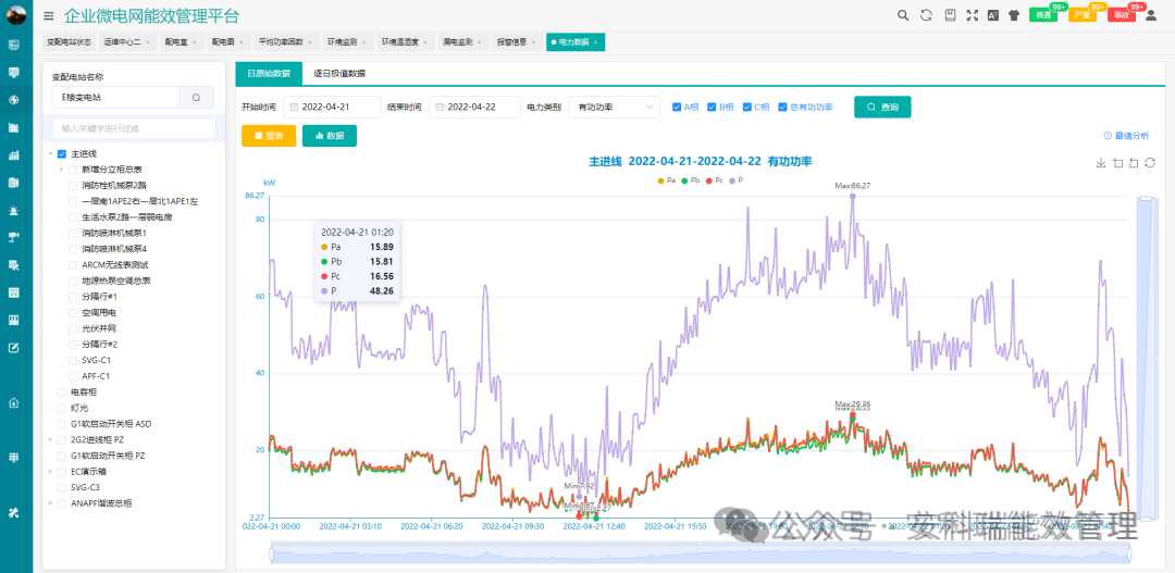 电力数据显示选定变电所选定回路的电力数据和曲线,包括电流、相电压、线电压、频率、功率因数、有功功率、无功功率、视在功率、电压、电流不平衡度等参数,曲线显示统计期内至大、至小、平均值,并支持导出图表;并支持支持逐日值统计,方便用户通过用户通过表格查询数据。