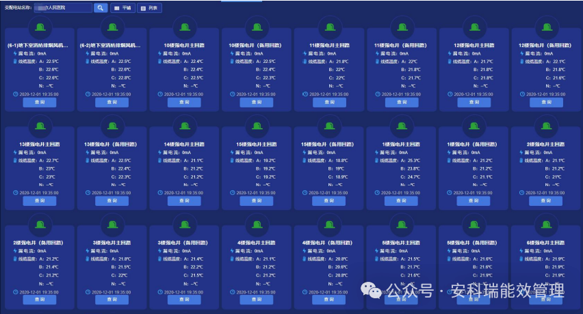 在高低压开关柜关键部位(电缆接头、断路器触头、刀闸开关、高压电缆中间头)安装电气接点在线测温装置,实时监测因氧化、松动、积尘等导致的接触电阻异常发热隐患,筑牢设备安全防线。同时,针对低压用电回路,监测剩余电流、温度及故障电弧,当剩余电流超标时即刻触发报警,助力运维人员及时排查漏电风险,有效预防电气火灾及触电事故。