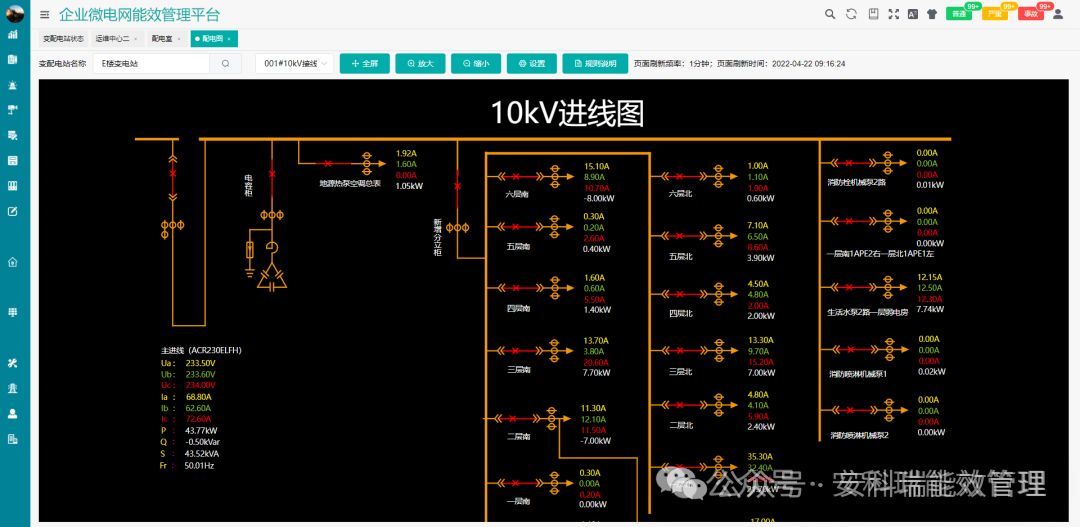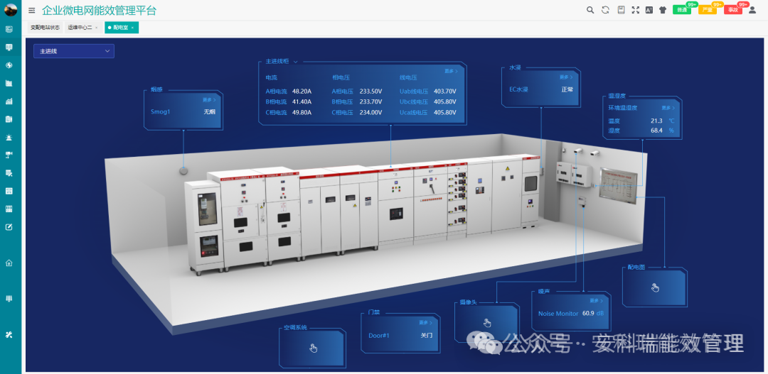 采用3D建模构图,和配电房实际环境匹配;实时监测配电房内安装的各类传感器和柜体状态; 实时监测配电房进出线的电力运行状态;