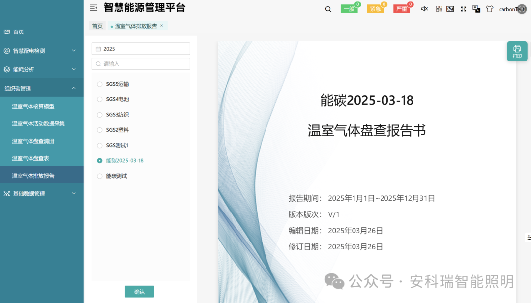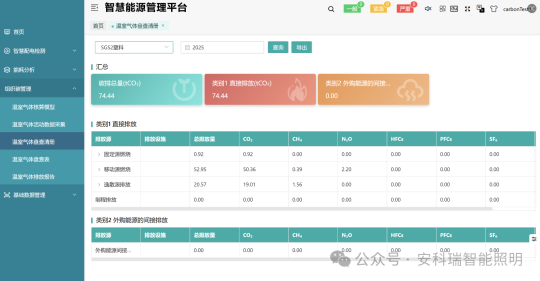 按年生成各排放源温室气体排放明细及总量,支持按排放类别分类汇总。