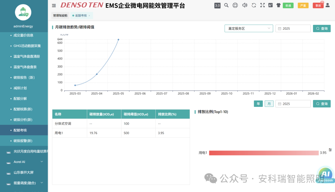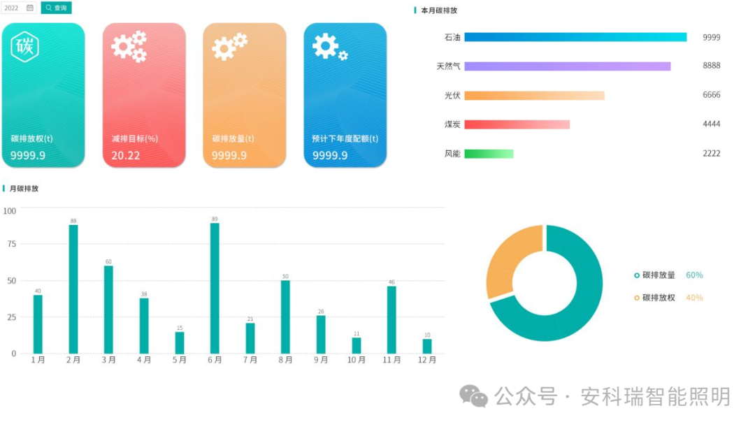 展示企业的年度碳排放趋势及排放指标、排放设施碳排放量与指标对比及排放占比、月/年度排放设施碳排放排名。