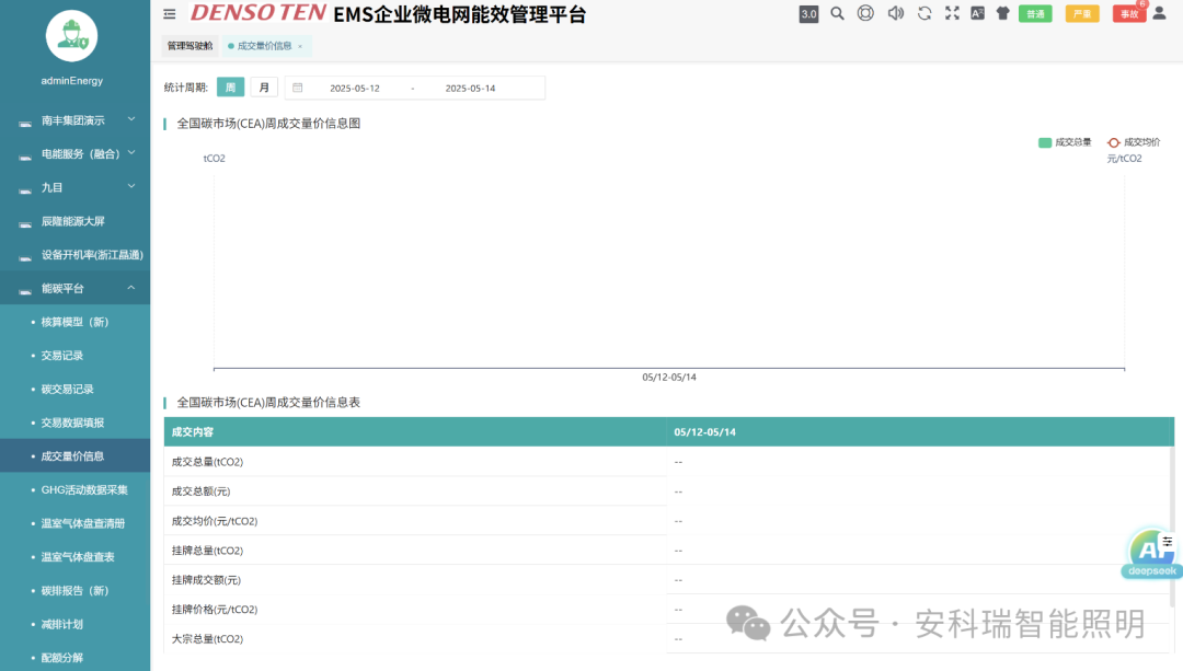 展示全国碳市场的成交总量、成交均价趋势图表,以及成交量价详细信息表格。