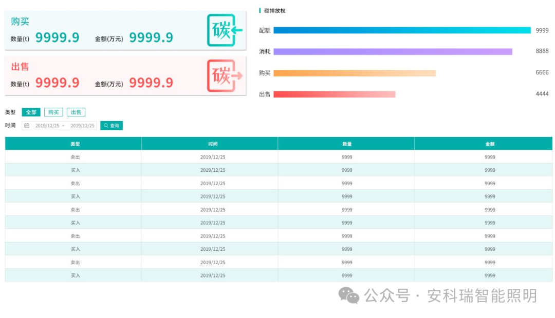 展示企业的碳交易统计数据,买入、卖出、消耗量及详情。