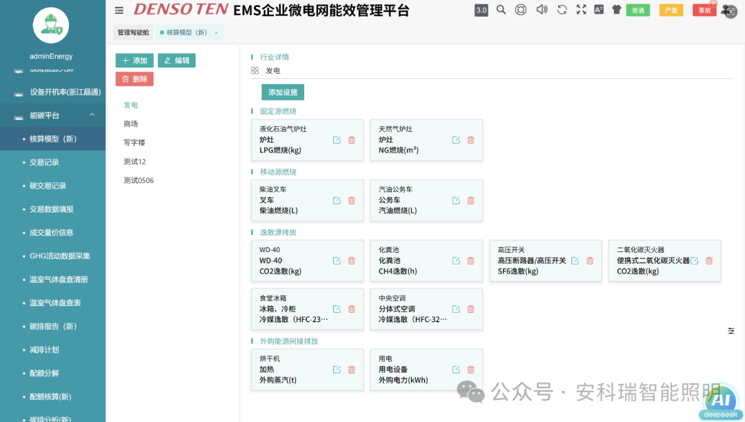 设置各行业的核算模型模板。按排放源类别添加排放设施,包括设施类型、排放源、计量单位、活动数据类别、排放因子类别、校正频率级别。