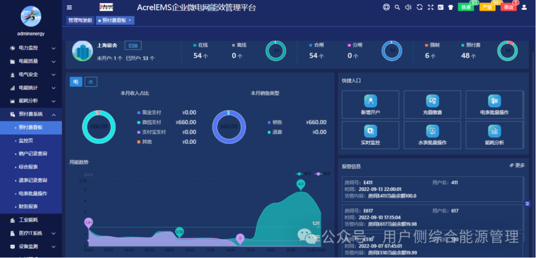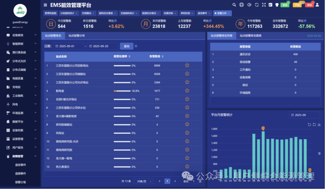 针对设备故障(电表通讯中断、水管泄漏)、参数异常(变压器温度过高)、能耗超限等情况,通过平台弹窗、短信、邮件实时报警,还能按严重程度分级推送——紧急故障直达运维人员,一般预警同步通知管理层,避免因延误处理导致安全事故或更大浪费。