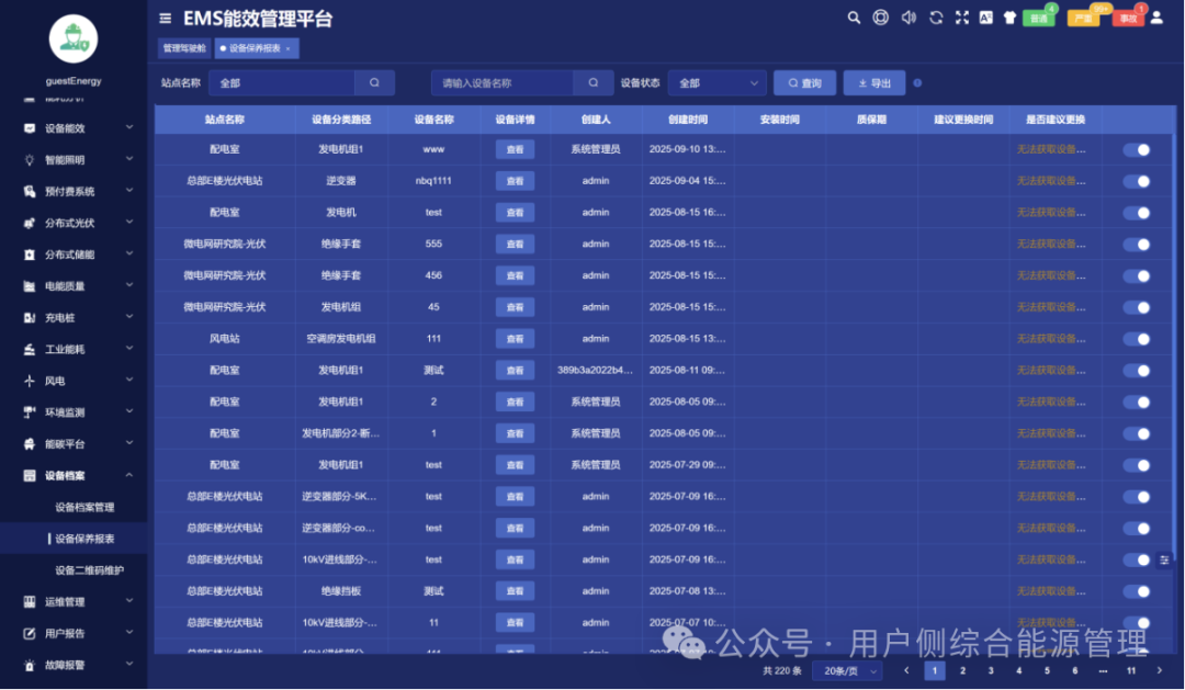 记录设备运行时长、维护记录,基于数据评估设备健康状态。当冷水机组运行满规定时间时,系统自动生成维保提醒,提示更换滤网;变压器绝缘老化风险上升时,提前安排检测,减少突发故障停机时间。