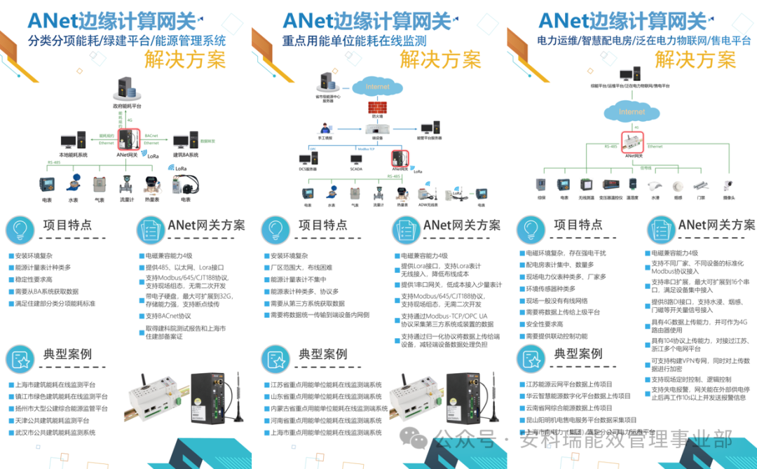 某公司是一家专注于“互联网+智慧能源"的创新型科技服务公司,与我司有深入的合作,采购了我司大量软硬件,通过数据分析为客户降低工商业用能成本,提高能源使用效率,达到实现节能降耗、安全运行、精细化管理的目标。在这个项目中,数据需同时转发至我司能耗系统、运维系统,现场不仅有我司设备,还有第三方温控仪、摄像头等设备。ANet网关除了可接入我司PZ/ACR/AMC/APM/AEW/ADW以及AM系列综保外,也可快捷方便的接入协议标准的第三方设备,同时支持4G路由功能,可为摄像头等其它需联网的设备提供外网接入。