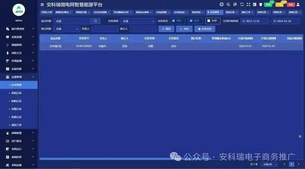 系统支持任务管理、巡检/缺陷/消警/抢修记录以及通知工单管理,并通过北斗定位跟踪运维人员轨迹,实现运维流程闭环管理。
