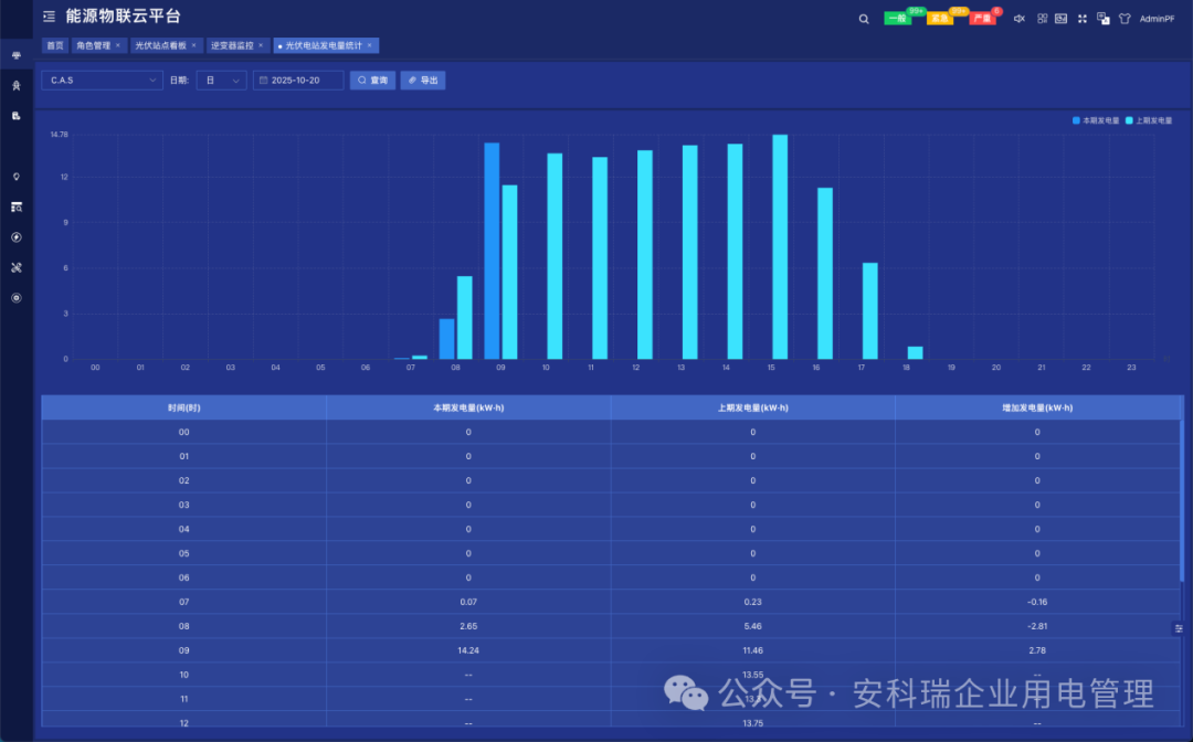 Acrel-EIoT能源物联网平台,通过 “物联网网关 + 双向计量电表"的组合,实现对市电进线功率与逆变器发电功率的实时监测。