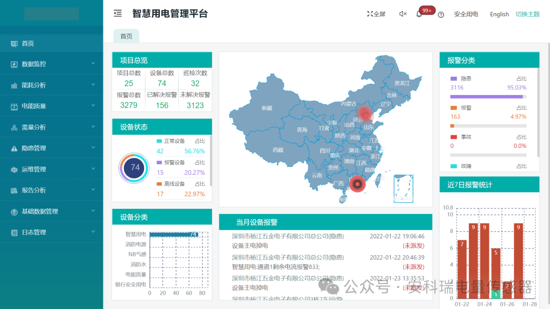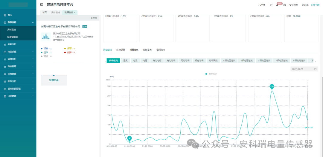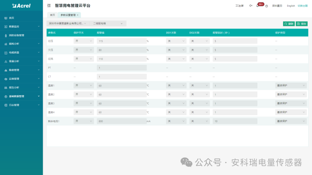 1)实时采集配电主回路剩余电流、温度、电流、电压、功率等电气参数,及时发现漏电、过载、过压、欠压、升温异常等电气安全隐患并按照严重等级报警;