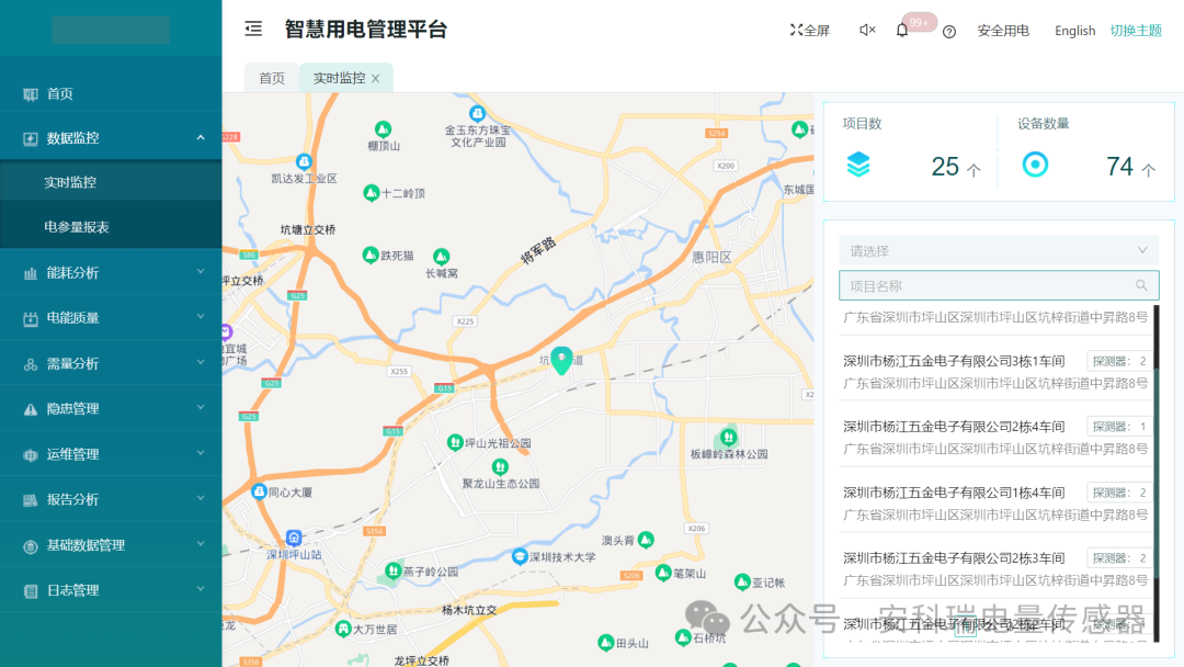 实时监控页面展示了当前用户关联的项目数量,项目位置,探测器数量;