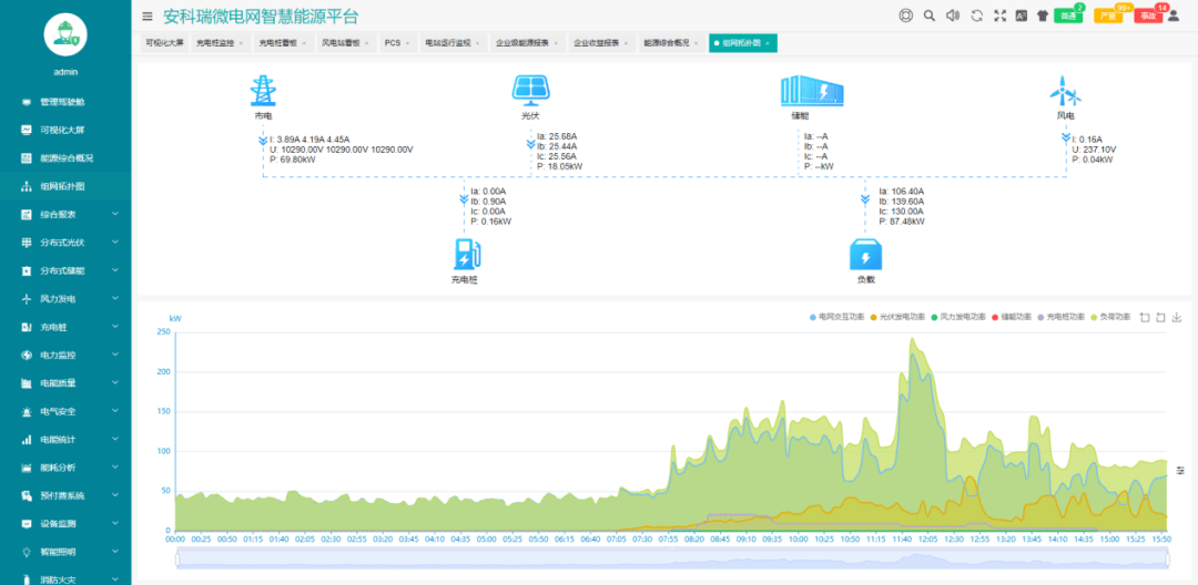 1.综合监控:实现园区变电站、光伏、储能、负荷、充电桩、环境数据的采集、监测、可视化展示、异常告警、事件查询、报表统计等功能;2.智能控制:协同光伏、储能、负载等多种能源主体,动态规划智能策略,实现储能、光伏协调控制,比如计划曲线、削峰填谷、防逆流、新能源消纳、需量控制等;3.能源分析:具备微电网能耗及效益分析、微电网经济运行分析、多维度电量分析,并进行日、月、年能源报表统计;4.碳资产管理:企业碳资产管理功能,包括碳盘查清册、碳配额管理、碳排放分析、碳流向、碳盘查报告、碳交易记录等等。5.功率预测:以历史光伏输出功率和历史数值天气数据为基础,结合数值天气预报数据和光伏发电单元的地理位置,采用深度学习算法建立预测模型库,实现光伏发电的短时和超短时功率预测,并经进行误差分析;同时对微电网内所有负荷,基于历史负荷数据,通过大数据分析算法,预测负荷功率曲线。6.优化调度:根据分布式能源发电预测、负荷预测结果,并结合分时电价、电网交互功率及储能约束条件等因素,以用电成本低为目标,建立优化模型,采用深度学习算法解析微电网运行功率计划,系统通过将功率计划进行分解,实现对光伏、储能、充电桩的优化控制。