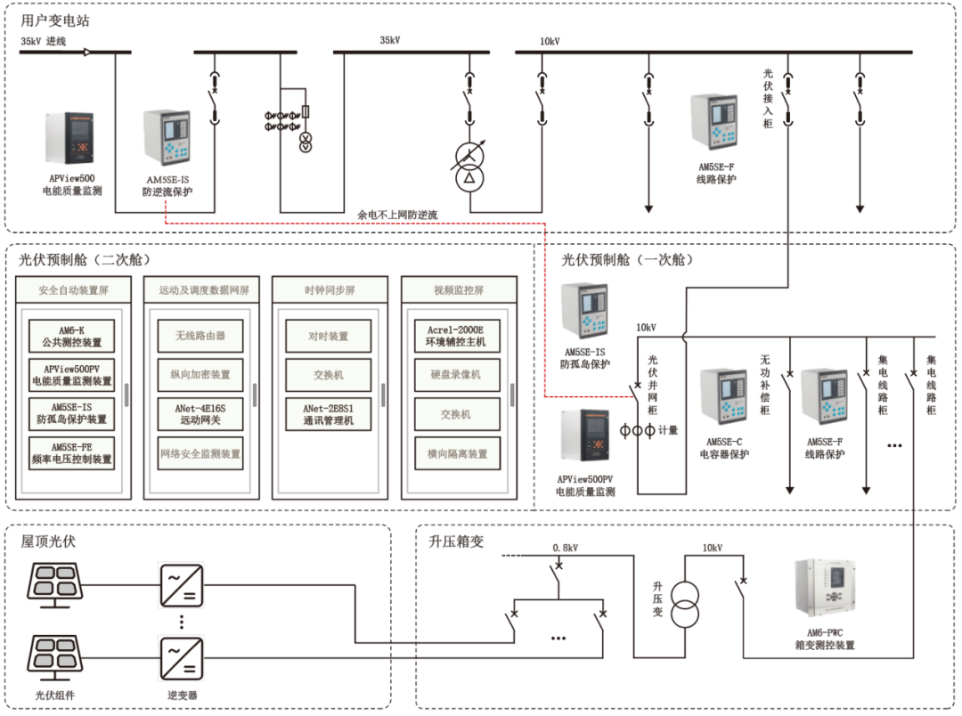 1.根据《分布式电源接入电网技术规定》和《电能质量管理办法(暂行)》等相关标准和规范要求,光伏电站并网点需要监测并网点电能质量;2.根据《分布式电源接入电网技术规定》并网点安装防孤岛保护装置,防止光伏电站孤岛运行;3.并网点安装国网电能计量表和远动装置用于上传光伏电站发电数据,由当地供电部门确定;4.对于自发自用、余电不上网系统,公共连接点处还需要配置防逆流保护装置,动作与切除或调节光伏逆变器,根据要求可使用不同的控制策略。