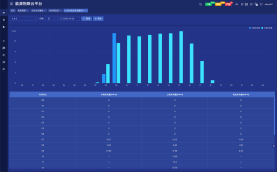 以柱状图和表格两种形式展示了光伏电站的发电量数据。切换年月日和日期可查看不同时间段的发电量与同时段往期数据。本页面支持报表导出,点击导出按钮即可导出相应数据,导出报表为excel格式。
