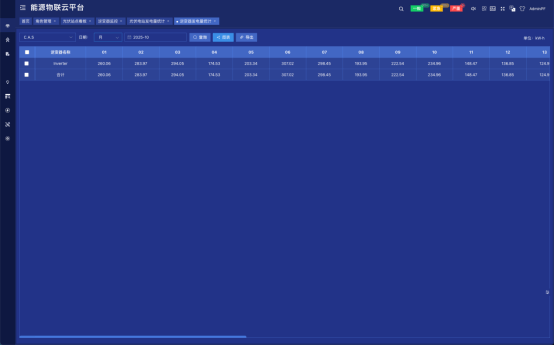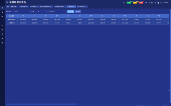 以表格的形式展示了各站点的发电收益数据。切换年月日和日期可查看不同时段的收益数据。本页面支持报表导出,点击导出按钮即可导出相应数据,导出报表为excel格式。
