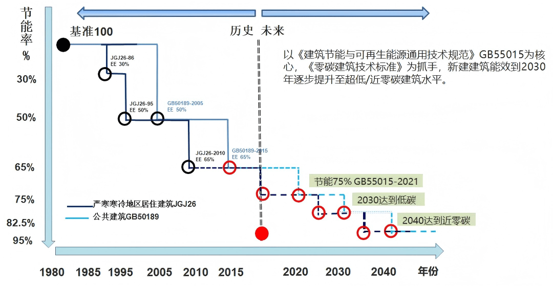 我国建筑节能以 1980-1981 年建筑能耗为基准,按 “每步在上一阶段基础上提效 30%" 划分阶段,目前住宅与公共建筑普遍执行 “节能 50%" 标准。以下聚焦零碳建筑核心知识: