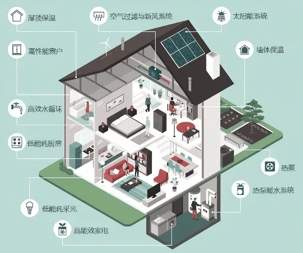 零能耗建筑:仅关注运行阶段,不消耗常规能源,依赖可再生能源;