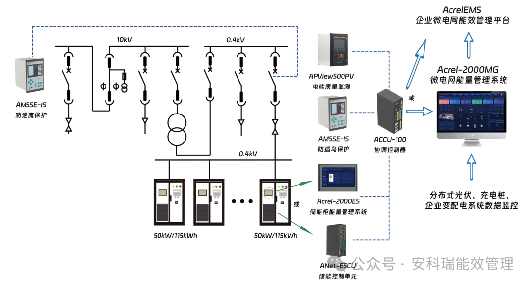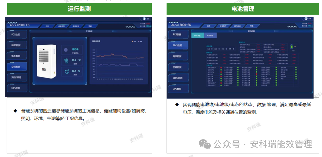 安科瑞Acre1-2000ES储能柜能量管理系统针对单体储能柜的管理,具有完善的储能监控与管理功能,涵盖了储能系统设备(PCS、BMS、电表、消防、空调等)的详细信息,实现了数据采集、数据处理、数据存储、数据查询与分析、可视化监控、报警管理、统计报表等功能。在高级应用上支持能量调度,具备计划曲线、削峰填谷、需量控制、备用电源等控制功能。既可以用于储能一体柜,也可以用于小型储能集装箱,是专门用于设备管理的一套软件系统平台,主要应用于储能一体柜或工商业储能集装箱。