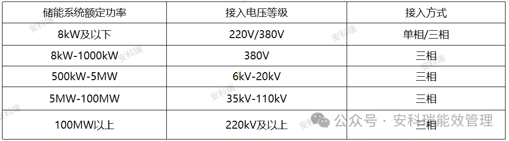 GB/T 36547-2018《电化学储能系统接入电网技术规定》对不同容量的储能系统并网电压等级做了详细的要求,电化学储能系统接入电网的电压等级应按照储能系统额定功率、接入电网网架结构等条件确定,不同额定功率储能系统接入电网电压等级如下表所示: