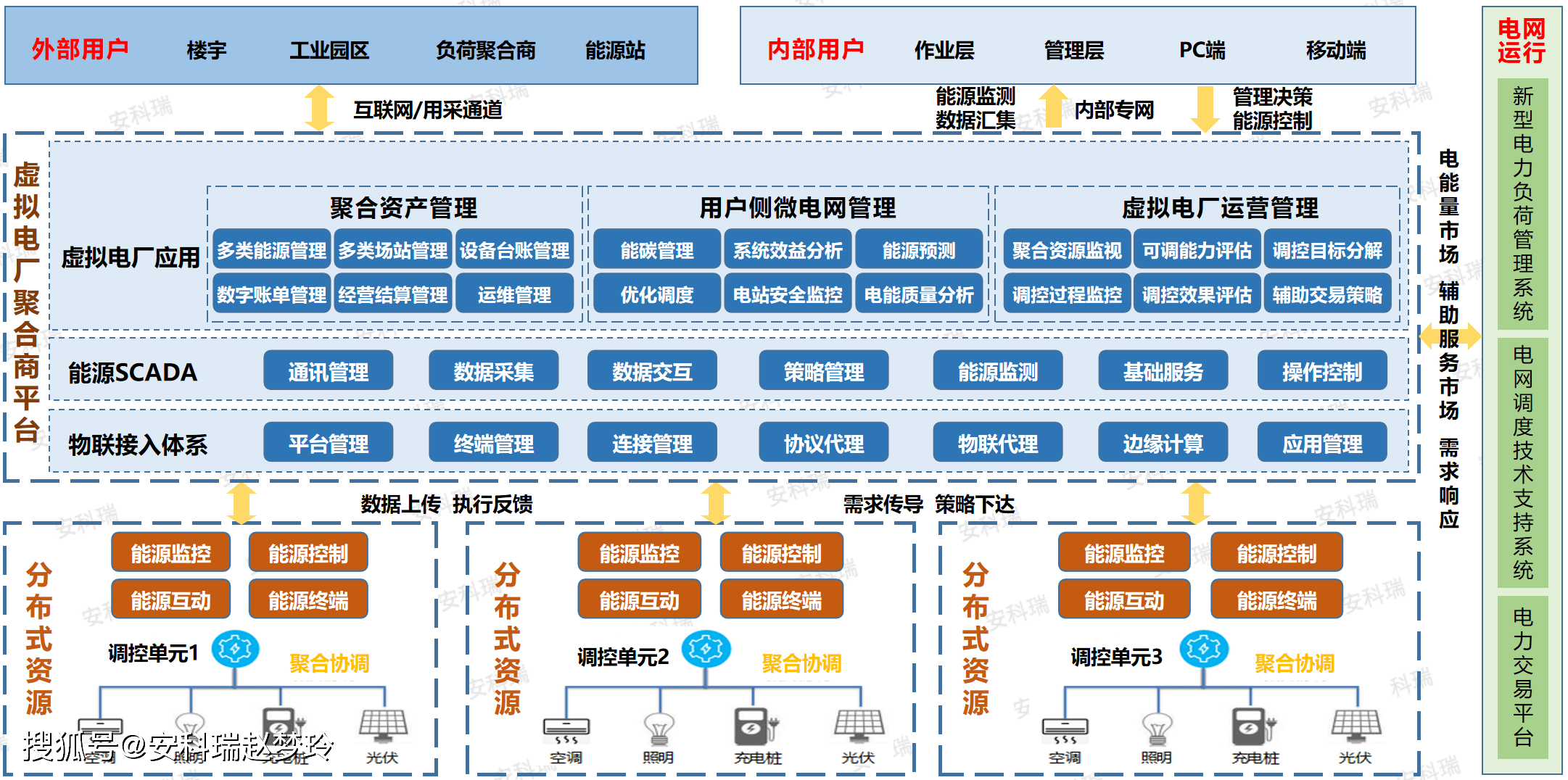 平台由“设备资源层-微电网层-虚拟电厂层"三层架构组成,贯通注册认证、统一接入、能力检测、调控服务、效果评价全业务链。