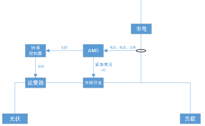 通过在市电进线处安装孤岛/逆流一体化装置(针对多并网点的,可以采用主从多防逆流装置),实时监测光伏上网情况,将监测信号上传给协调控制器。通过对逆流数据的逻辑计算对逆变器的输出功率进行调整,实现无逆流情况。