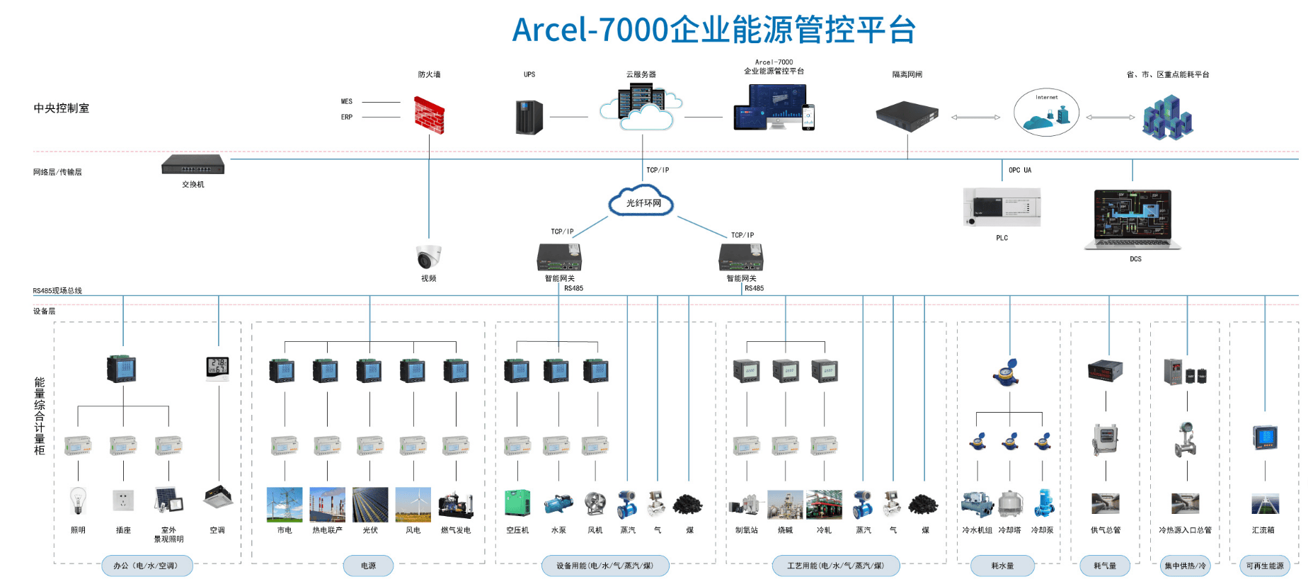系统由感知层(能源计量终端)、网络层(通讯管理终端)和平台层(企业能源管控平台)三个部分组成。