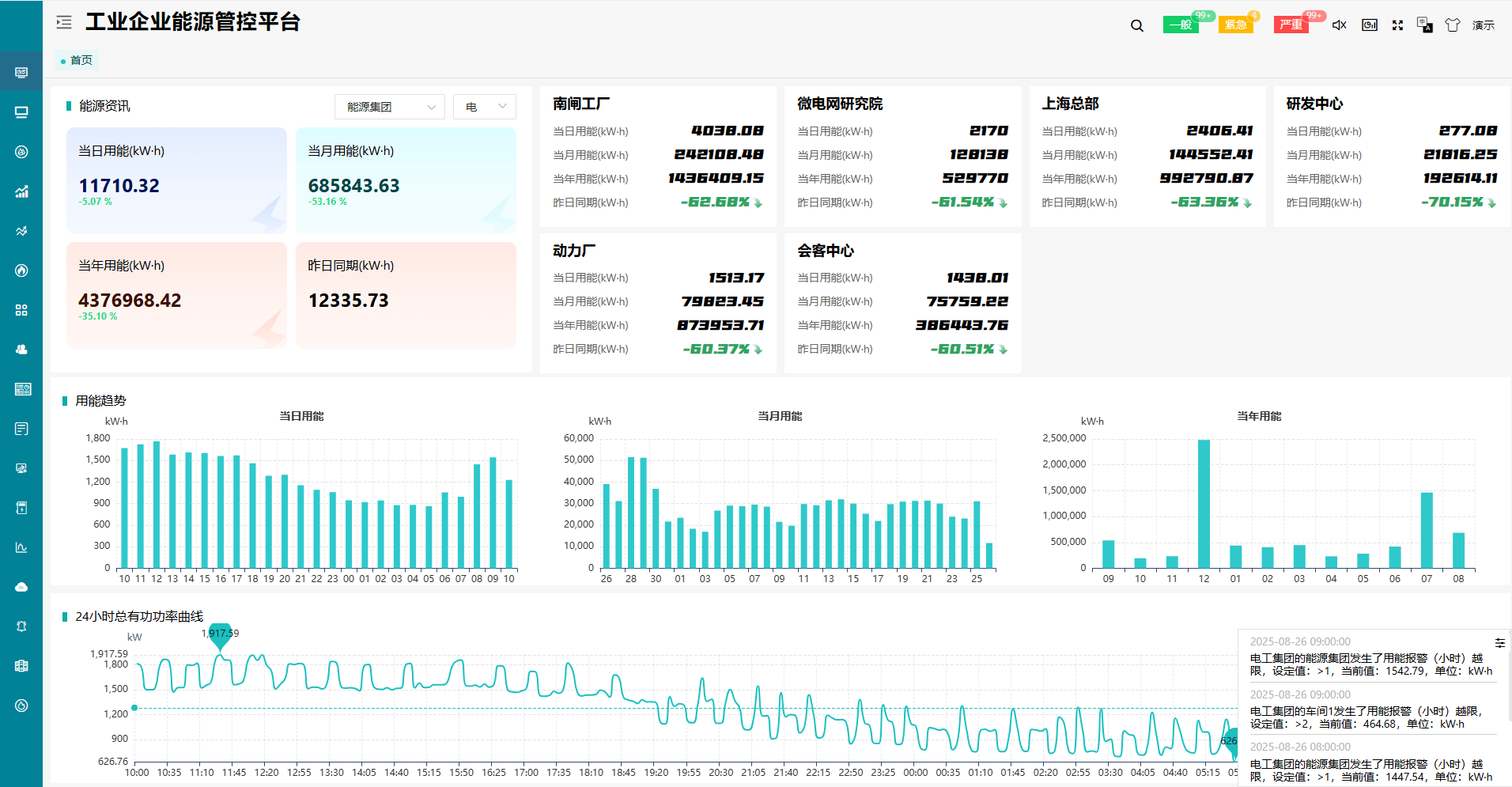 全维度数据可视化:通过自定义驾驶舱,企业可以根据自身需求,实时展示能源流向、负荷曲线、碳排放趋势等关键信息,仿佛为能源管理装上了一双 “透视眼"。平台还支持厂区、车间、设备三级能耗钻取,层层深入,让能源消耗的细节清晰呈现。