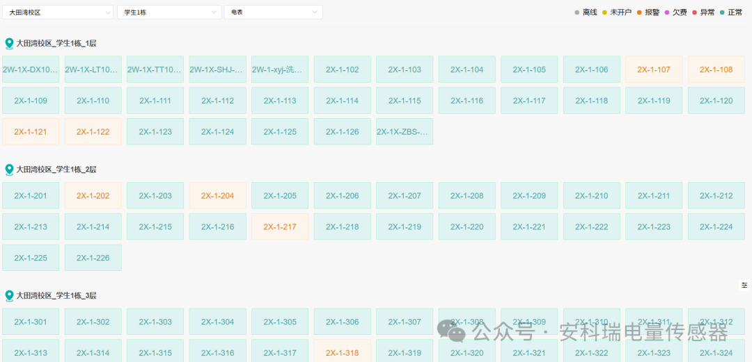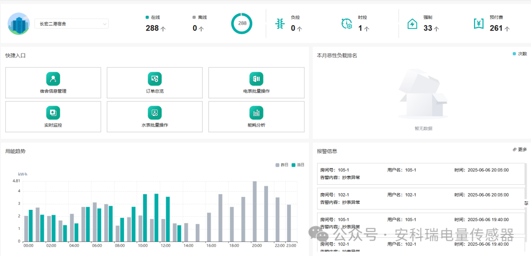 覆盖学生宿舍与教职工宿舍,采用按房间独立计量方式。准确统计每间宿舍的实时水电用量,自动生成清晰的用量变化曲线,直观呈现每日、每月用能波动情况,为收费核算工作提供准确、可靠的数据支撑。
