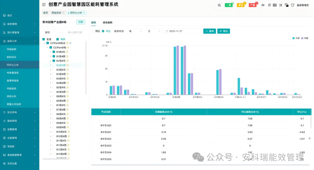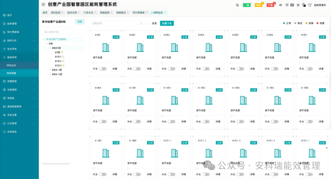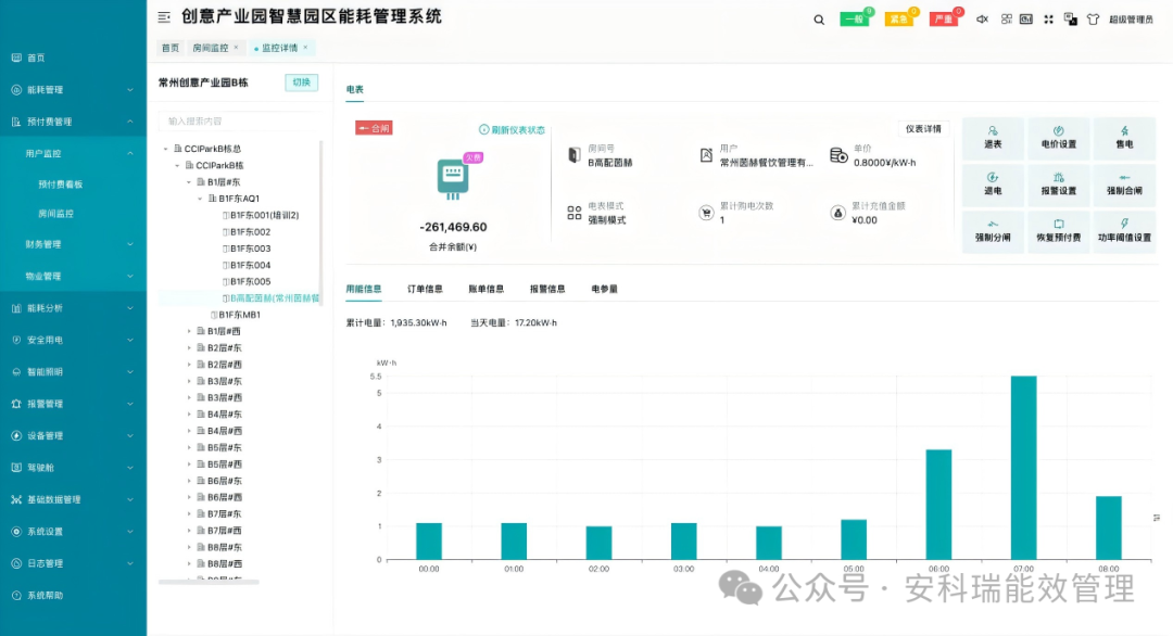 2、对园区运营方:管理平台可实现按楼栋、楼层、房间等多维度能耗数据自动统计与趋势分析。同时,系统能够监测异常用电和异常用水,及时发出告警,帮助管理人员快速定位能耗“黑洞"与风险点