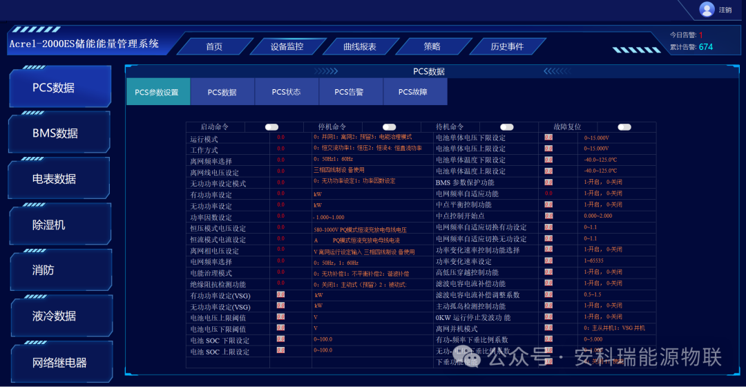 设备监控:PCS运行模式、启停、限值等参数设置;PCS交直流侧电压、电流、功率等数据;PCS运行状态、模式、工作方式、接触器等状态;PCS运行中过压、过频、温度过高等故障展示。