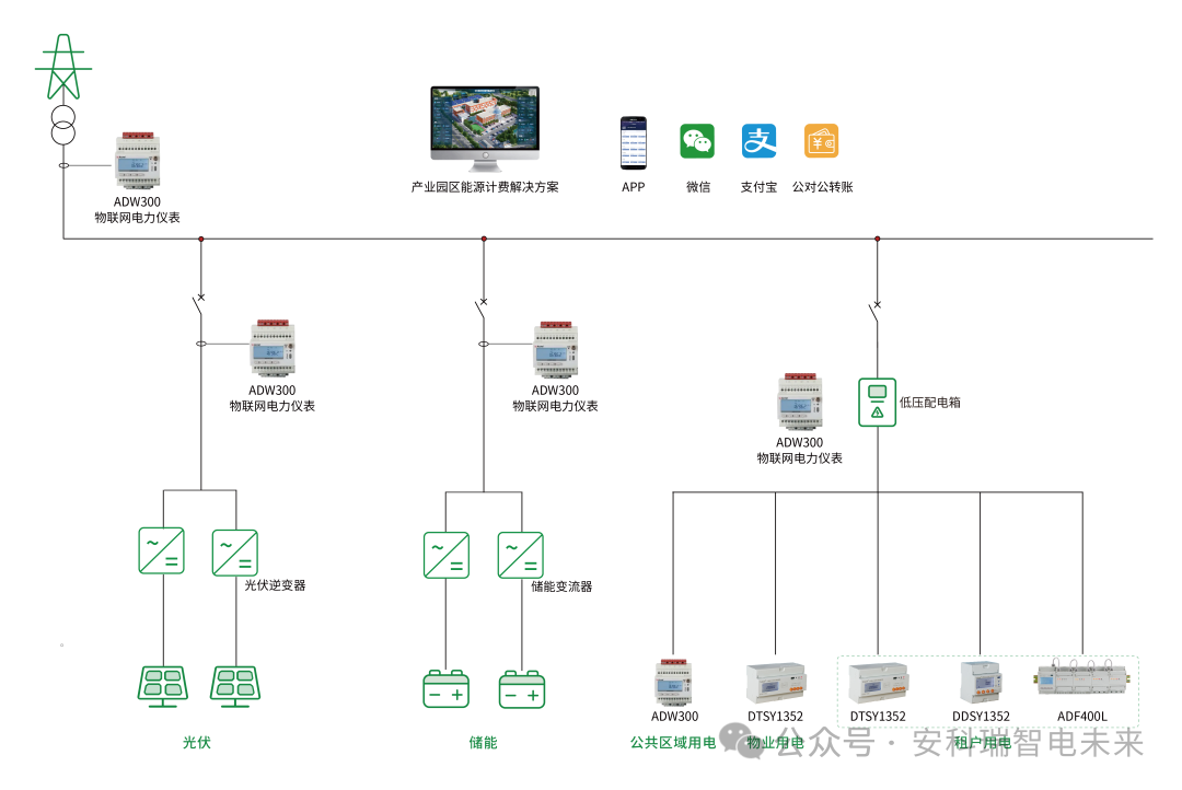 适合中大型产业园区、零碳园区!在变压器、光伏、储能、公区设施、租户终端等关键节点安装智能电表,实现全链条计量。支持光伏、储能收益合理分配,分摊更细化,数据更准确。