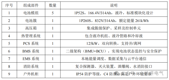 本系统采用高度集成的一体化设计,将电池簇、储能变流器(PCS)、电池管理系统(BMS)、储能控制器(EMS)、液冷热管理系统及多级消防系统整合于单台户外机柜内。其中 5 个标准液冷电池模组(1P52S,166.4V/314Ah)通过高压箱并联组成电池簇(1P260S,832V/314Ah),高压箱内置簇级 BMS(BCU),负责电池簇级保护、状态监测及与 PCS/EMS 通信;PCS(125kW)实现直流侧与交流侧(400V 三相四线)的双向能量转换;EMS 储能控制器协调 PCS、BMS、消防、温控等子系统,执行能量管理策略;热管理系统负责电池模块的制冷、加热;消防系统负责整个柜体的消防状态检测以及火灾预防。
