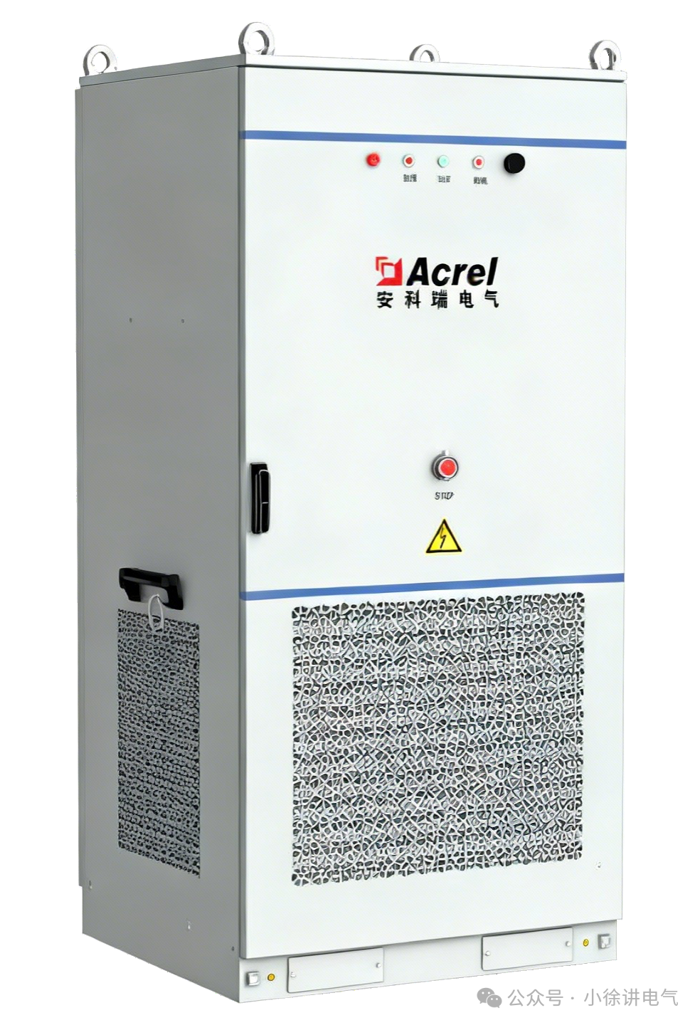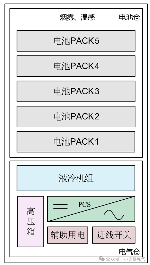 底,装有液冷机组、储能变流器、高压箱、辅助用电和进线开关等。