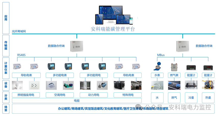 感知层:部署碳计量电表、环境传感器等设备,实时采集全维度能源数据,构建园区能源数字底座。